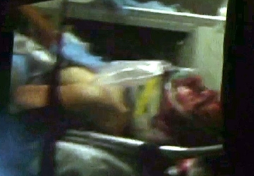 This still frame from video shows Boston Marathon bombing suspect Dzhokhar Tsarnaev visible through an ambulance after he was captured in Watertown, Mass. (AP Photo/Robert Ray)